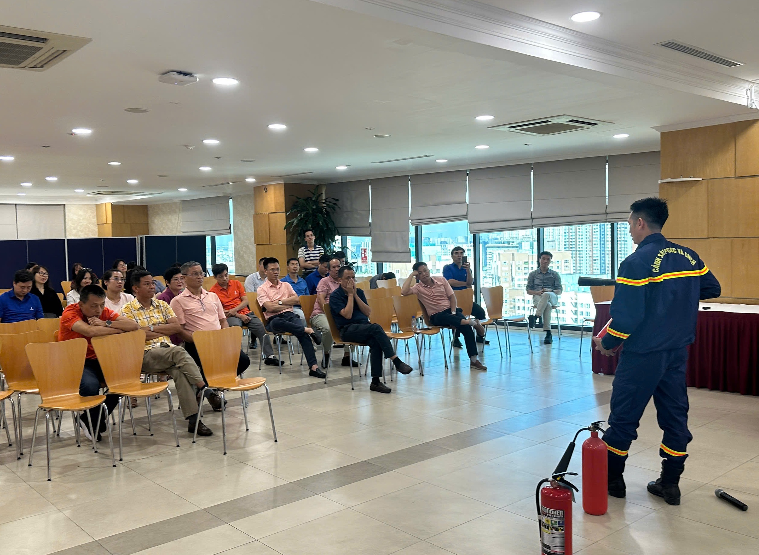 Phần học thực hành được học viên hưởng ứng sôi nổi, tập trung cao để nắm vững kỹ năng xử lý tình huống khẩn cấp và sử dụng thành thạo các phương tiện PCCC được trang bị tại cơ sở. Giảng viên phối hợp với Ban An toàn xây dựng phương án thực hành thoát hiểm khẩn cấp sát với điều kiện thực tế của tòa nhà văn phòng. Phân chia các nhóm học viên để tham gia các tình huống giả định, từ phát hiện cháy, báo động, sơ tán đến tập kết an toàn. Học viên được hướng dẫn chi tiết tính năng, tác dụng và cách sử dụng các loại phương tiện PCCC như bình chữa cháy bằng bột, khí CO₂, chăn chữa cháy… Các thao tác bảo hộ, chữa cháy trực tiếp trên mô hình đám cháy giả định được thực hành dưới sự giám sát của giảng viên. Nội dung thực hành cũng bao gồm sử dụng đúng cách mặt nạ phòng độc, bảo đảm an toàn khi thoát nạn trong môi trường nhiều khói, khí độc. Các cán bộ, nhân viên được mời tham gia diễn tập theo kịch bản giả định cháy tại một khu vực trong tòa nhà, thực hiện đồng bộ quy trình báo cháy, cắt điện, dập lửa ban đầu, tổ chức thoát nạn, cứu hộ và tập kết đúng vị trí. Toàn bộ quá trình thực hành giúp học viên không chỉ nắm rõ lý thuyết mà còn hình thành phản xạ nhanh, kỹ năng phối hợp nhóm, từ đó nâng cao khả năng xử lý hiệu quả khi xảy ra sự cố cháy nổ thực tế.